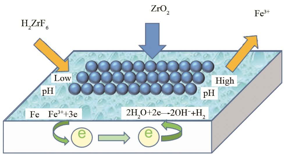 經(jīng)上述反應(yīng)后,金屬基材表面會(huì)形成一種“ZrO2-Fe-ZrO2”結(jié)構(gòu)的溶膠。隨著反應(yīng)的進(jìn)行,溶膠的交聯(lián)密度逐漸增大,不斷凝聚沉積,最終形成連續(xù)致密的ZrO2膜層。鋼鐵表面鋯鹽轉(zhuǎn)化成膜過程原理如下圖: